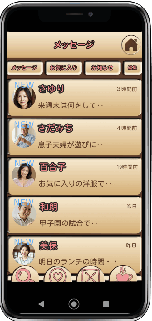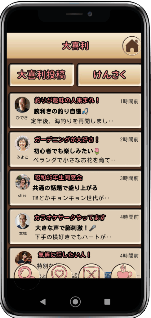・簡単操作 初心者でも使いやすい、シンプルな画面設計。 ・趣味のグループ 旅行、料理、健康、ガーデニング、読書など、多彩なトピックの自由な書き込みで趣味友を募集。 ・安全な環境 本名登録不要でプライバシーを守りながら利用可能。 ・メッセージ機能 完全プライベートな個別のチャットでも可能。